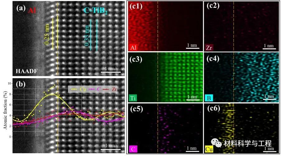 图6 Al-Cu-Zr合金中C-TiB2/Al的界面表征。C在C-TiB2中的掺杂避免了Zr在C-TiB2/Al界面上的偏聚,保留了TiAl3-2DC的辅助形核作用,因此Zr无法致其细化“中毒”。基于以上基础研究,研究团队首次提出TCB复合体的演变形核机制,从根本上同时解决了Si致细化“中毒”难题和Zr致细化“中毒”堵点问题,有望为突破铝合金强韧性不匹配、综合性能不达标和加工性差等发展瓶颈提供有效解决策略。该研究对加快铝加工行业转型升级和高端装备制造业轻量化发展具有重要的现实意义和重大的战略价值。