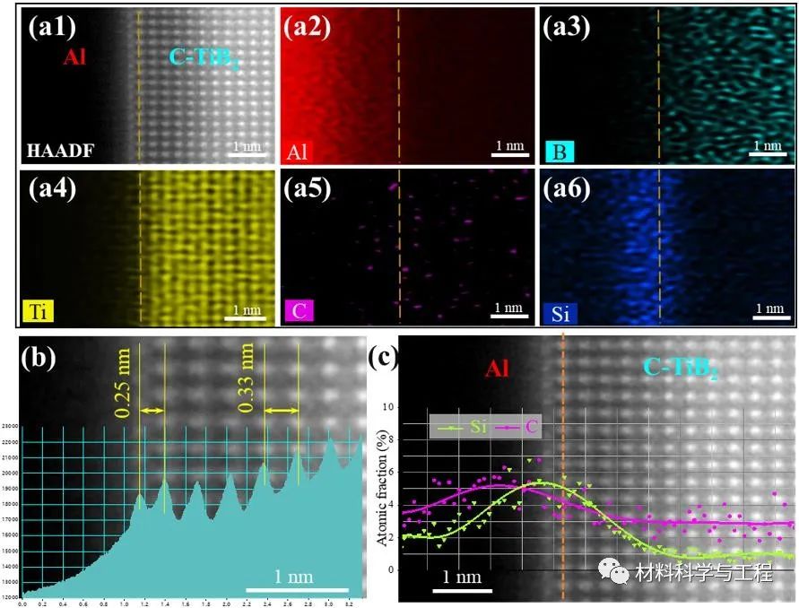 图5 Al-Si合金中C-TiB2/Al的界面表征。C在C-TiB2中的掺杂降低了Si在C-TiB2/Al界面上的偏聚倾向,保留了TiAl3-2DC的辅助形核作用,Si致细化“中毒”无法发生。