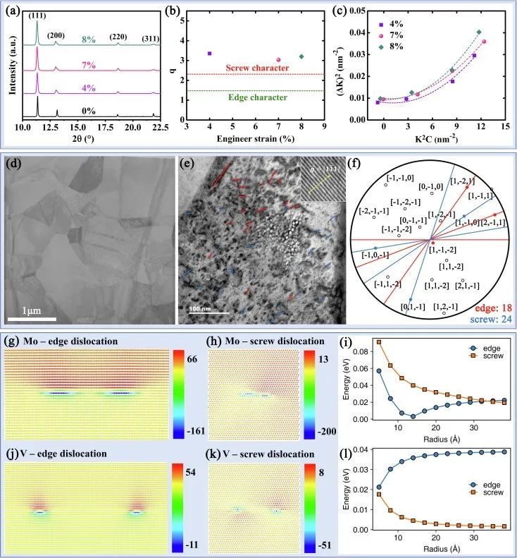 图4活性位错的实验和理论证明。(a) 900°C-1 h退火Ni80Mo20合金在工程应变分别为0%、4%、7%和8%时的高能x射线衍射图。(b)位错特征参数q随工程应变的演化。q的值由卷积多重整体剖面(CMWP)得到。(c)在工程应变分别为4%、7%和8%时,根据改进的Williamson-Hall, ΔK2 vs K2C曲线。(d)塑性应变为5%的900°C-1 h退火Ni80Mo20合金在和附近的双束条件下的TEM图像和(e) 环形亮场(ABF)-STEM图像。红色和蓝色线分别为边缘位错和螺钉位错。(f)对应于(e)的平投影。Ni80Mo20合金中具有边缘位错(g)和螺旋位错(h)的Mo溶质之间的相互作用。数值由meV给出的相互作用能着色。(i) Ni80Mo20合金中Mo以位错核为中心的积分半径与总相互作用能的关系。NiCoV中V溶质与边缘(j)位错和螺旋(k)位错的相互作用。(l) NiCoV中V的总相互作用能随位错核为中心的积分半径的变化。