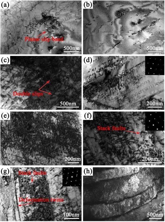 图5晶粒尺寸为4.8 μm的Ni80Mo20合金在(a,b) 2%、(c,d) 15%、(e,f) 22.5%和(g,h)断裂拉伸应变下的变形组织。SAED图案取自[110]区域轴。