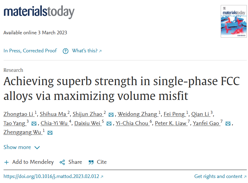 基于上述场景,湖南大学吴正刚教授团队联合香港城市大学、东北大学、国立台湾大学、田纳西大学等知名高校依靠失配体积最大化策略成功设计出具有优异屈服强度(∼1.05GPa)和良好延展性(∼37%)的SP-FCC合金。由此产生的成分简单的合金具有比所有现有SP-FCC合金更严重的体积不配合,导致有史以来最高的kHP和体现的 Δσss。从根本上说,我们的工作强调,失配体积可以作为kHP的相关指标,并证明螺钉位错也可以控制具有极端晶格畸变的SP-FCC合金的强化,这在以前的研究中被忽视了。相关研究成果以题“Achieving superb strength in single-phase FCC alloys via maximizing volume misfit”发表在Materials Today上。