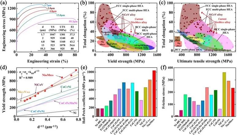 图3非凡的强度-延展性组合。(a)不同晶粒尺寸Ni80Mo20的典型工程应力-应变曲线。(b) Ni80Mo20等金属材料的屈服强度与总伸长率的关系,(c)极限抗拉强度与总伸长率的关系(表S2)。(d) Ni80Mo20和CoCrFeMnNi、CoCrFeNi、CoCrNi、NiCoV、Ni63.2V36.8、Ni等几种FCC合金屈服强度对晶粒尺寸的依赖关系(见图)。S4、S5和S6为NiCoV和Ni63.2V36.8的代表性微观结构、工程应力-应变曲线和霍尔-佩奇关系,如本研究中再现的)。(e) 霍尔-佩奇系数和(f)不同SP-FCC材料的摩擦应力(表S3)。