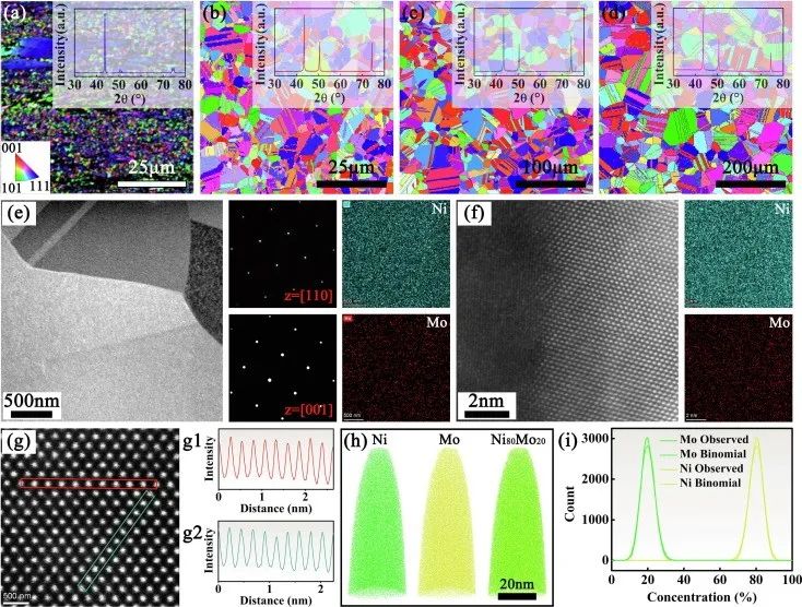 图2Ni80Mo20的代表组织。Ni80Mo20分别在(a) 800℃、(b) 900℃、(C) 1000℃和(d) 1100℃退火1 h的EBSD逆极图(IPF)图。插图显示了相应的XRD图谱。(e) Ni80Mo20在900°C退火1 h后的低倍率HAADF-STEM图像和(f)高分辨率HAADF-STEM图像。右侧图像为SAED图案或相应的STEM-EDS图。SAED模式证实Ni80Mo20是具有FCC结构的SP固溶体。STEM-EDS图谱也证实了Ni和Mo在晶界处没有明显的化学偏析和结构转变。(g)晶粒内部的HAADF-STEM显微照片和g中红色和绿色平方区域的(g1, g2)强度线轮廓。(h) Ni和Mo原子的3D APT重建。(i)元素频率分布分析。经STEM和APT分析,证实无局部化学波动。