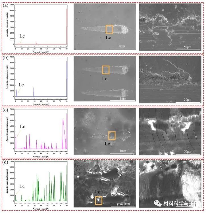 图6 Zr-2.5Nb基体及热氧化样品划痕测试及形貌:(a)500℃;(b) 600℃;(c) 700℃;(d) 800℃。
