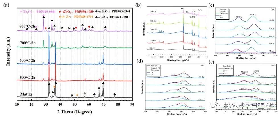 图1 Zr-2.5Nb基体及热氧化样品XRD图和XPS图。