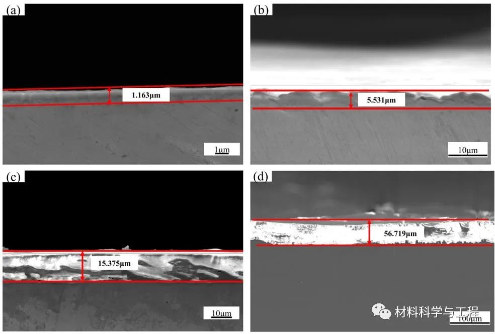 图2 Zr-2.5Nb热氧化样品膜厚图:(a)500℃;(b) 600℃;(c) 700℃;(d) 800℃。