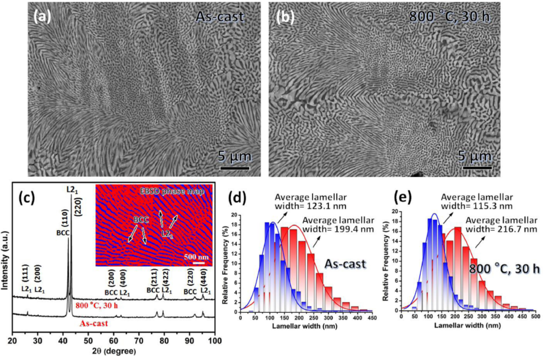 Al17Ni34Ti17V32合金的相和组织信息。(a-b)铸态和退火态合金的背散射电子(BSE)图像。(c)铸态和退火态合金的XRD谱图。插图显示铸态合金的EBSD相图。(d-e)铸态合金和退火态合金的统计层状宽度分布。