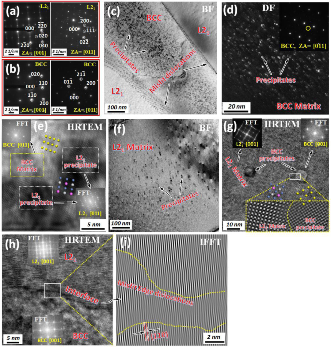 Al17Ni34Ti17V32合金的透射电镜表征(a-b)共晶L21和BCC相沿两个不同区域轴([001]和[011])的SAED图。(c)铸态合金的高炉透射电镜图像,显示BCC相中有高密度的纳米沉淀物。(d)从(d)插图中黄色圈出的{111}超晶格点获得的铸态合金BCC相的DF TEM图像。插图显示了BCC相的[011]区轴的SAED模式。(e)铸态合金的HRTEM图像,显示L21沉淀嵌入BCC基体内。左上插图展示了FFT中BCC矩阵的电子衍射图(EDP);右下插图显示了FFT中L21沉淀物的EDP。(f)铸态合金的高炉透射电镜图像,显示共晶L21相内析出相的分布。(g) HRTEM图像显示嵌在L21基质内的BCC沉淀。左上方的插图显示了FFT中L21矩阵的EDP;右上方插图为FFT对BCC析出物的EDP;右下插图为BCC沉淀/L21矩阵界面的HRTEM放大图像。(h)铸态合金HRTEM图像,显示L21/BCC的共晶相界面。上面和下面的插图分别显示共晶L21和BCC相的edp。(i)来自反FFT的放大hrtem图像,显示(h)中的界面区域。