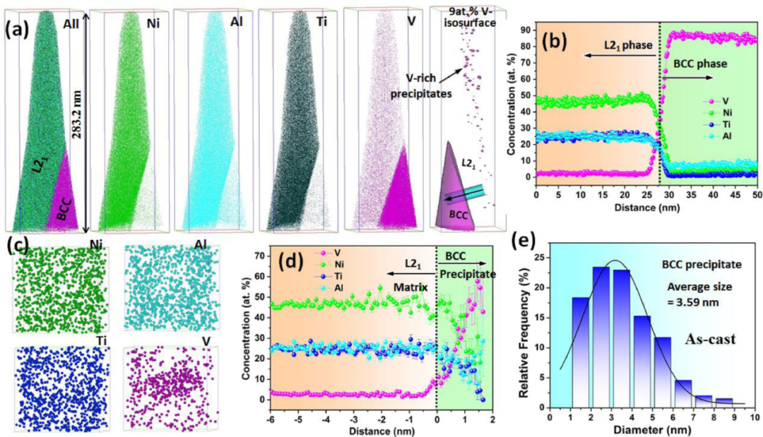 共晶L21相的APT表征。(a)各种元素的3d重建离子图,包括共晶L21相和一小部分BCC相。(b) BCC/L21共晶相界面的一维组成剖面。(c)从(a)中的BCC纳米沉淀物中捕获的离子图的3d重建,显示了V原子团簇。(d) BCC析出相/L21基体界面的一维组成剖面。(e) BCC纳米沉淀物的统计尺寸分布。