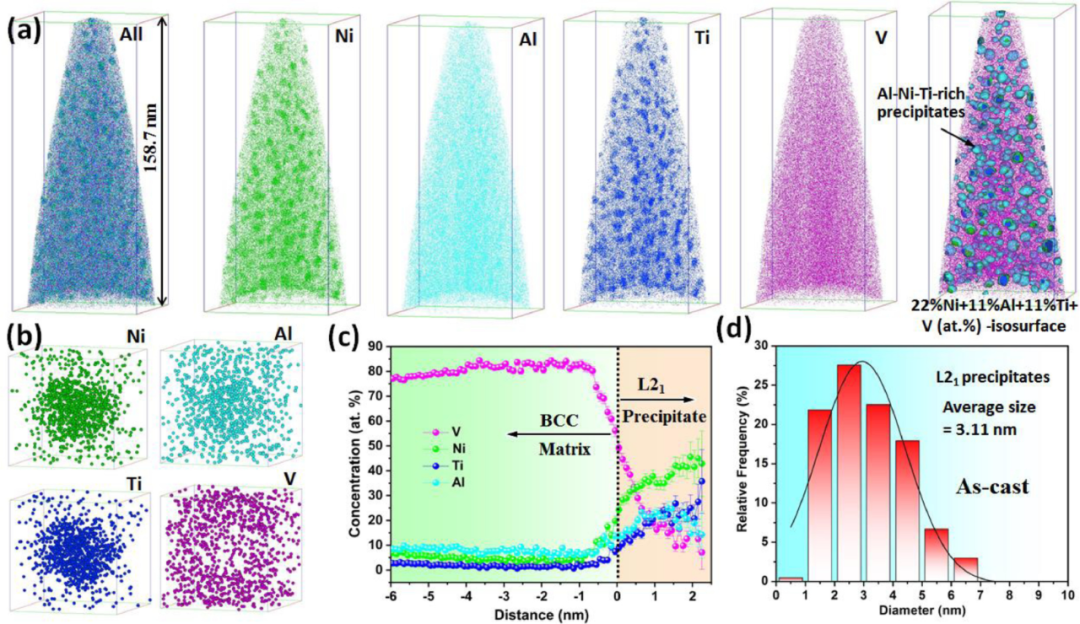 共晶BCC相的APT表征。(a)包含各种元素的三维重建离子图。(b)从(a)中L21沉淀中捕获的离子图的3d重建,显示Al, Ni和Ti原子团簇。(c) L21沉淀相/BCC基体界面的一维组成剖面。(d) L21纳米沉淀物的统计尺寸分布。