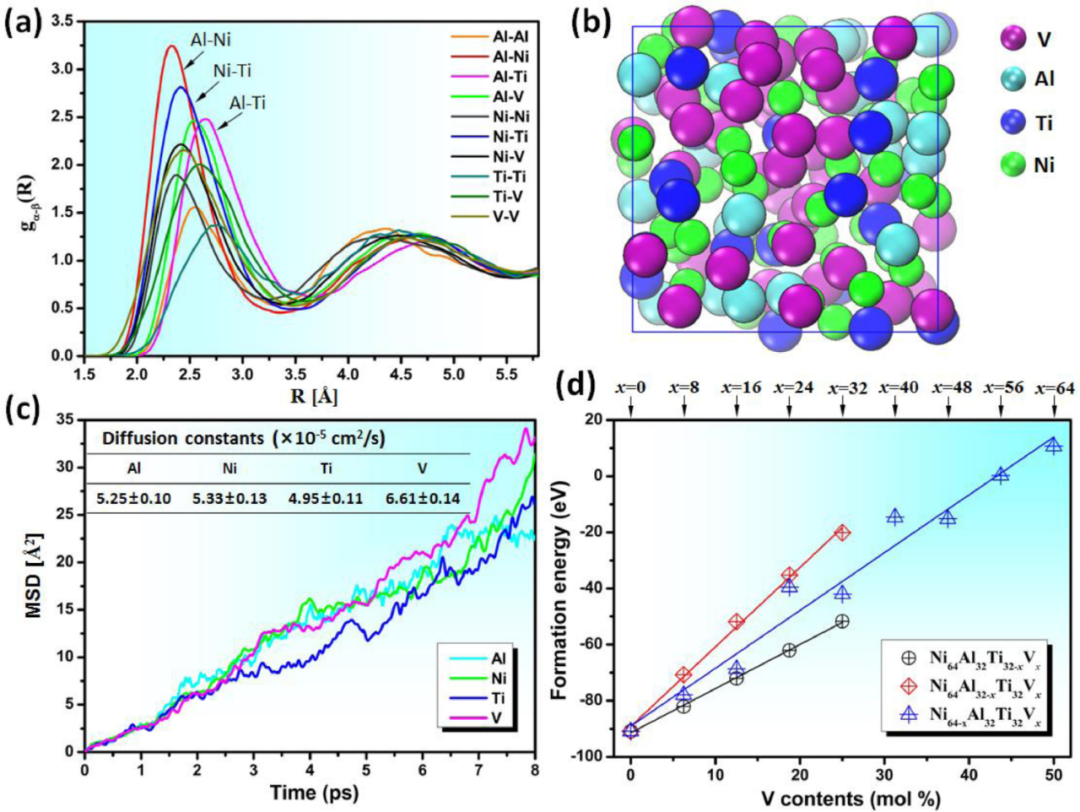 Al17Ni34Ti17V32合金的第一性原理计算。(a)在T = 3000 k时AIMD模拟的部分pdf (b) AIMD模拟期间原子结构的快照。(c)各元素MSD随时间变化的计算结果,图中为T = 3000 k时预测的各元素扩散常数。(d) dft通过用V代替Ni2AlTi型L21相中的Ni、Al和Ti预测的生成能。综上所述,我们提出了一种有效和通用的设计策略,通过引入低密度含元素heusler型(L21)相和构建低晶格失配共晶相界面,开发轻质、超强、高热稳定的EHEAs。基于这一新策略,我们成功地设计了一种新型的Al17Ni34Ti17V32 EHEA,具有均匀的超细层状结构(层间间距约320 nm),并且是之前报道的所有EHEA中密度最低的之一(约6.2 g/cm3)。这种大块EHEA具有特殊的尺寸和微观结构稳定性,并且比大多数报道的RHEAs, LWHEAs, EHEA和传统高温合金具有更高的高温硬度和SYSs。AIMD模拟、DFT计算和CALPHAD预测进一步证实了Al17Ni34Ti17V32 EHEA的热稳定性。EHEA之所以具有优异的高温性能,主要是由于低晶格错配所产生的超细和热稳定共晶结构、极其稳定的L21结构,以及由于预先存在的共晶相界面位错网络和纳米沉淀物的阻碍而产生的低位错迁移率。总体而言,目前由L21和BCC结构组成的轻质EHEA系统是受压缩载荷影响的高温应用的有前途的候选。