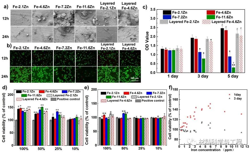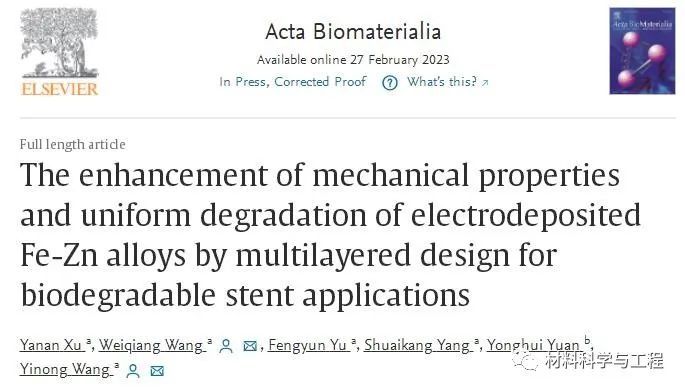 研究结果显示,所有合金的基体均为亚稳态的有序固溶体相,其中只有Zn含量提高到11.6%时才有细小的第二相析出(室温下Zn在Fe中的溶解度小于2%)。层状Fe-Zn合金的屈服强度超过350MPa,延伸率超过20%,并且通过浸泡测试所得的腐蚀速率高达0.367mm/y。不仅如此,层状设计还解决了Fe基材料的局部腐蚀问题。在随后的血液相容性和细胞相容性测试中,低Zn含量的单层和多层Fe-Zn合金均表现出良好的生物相容性。该研究以“The enhancement of mechanical properties and uniform degradation of electrodeposited Fe-Zn alloys by multilayered design for biodegradable stent applications”为题发表在生物材料领域的权威期刊《Acta Biomaterialia》上。