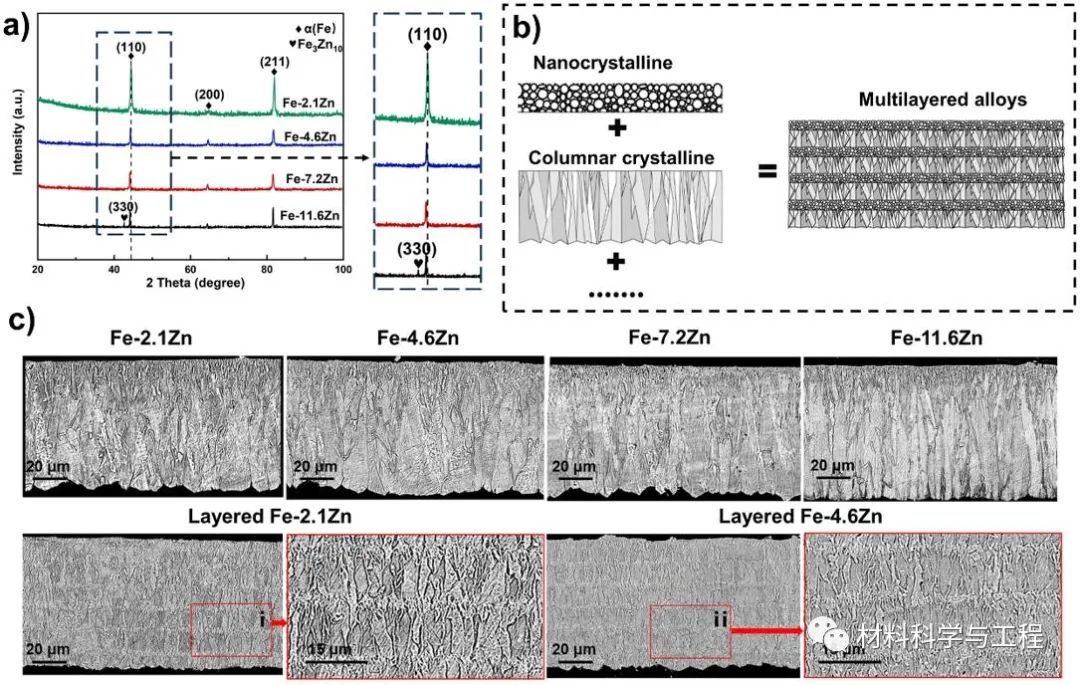 Fig. 1. (a) XRD patterns of the electrodeposited Fe-Zn alloys and the magnification of diffraction peak of (110). (b) Schematic diagram of the microstructure of multilayered alloy. (c) The microstructure of Fe-Zn alloys with monolayered structure and multilayered structure and the enlarged view of areas ⅰ and ⅱ of multilayered alloys.