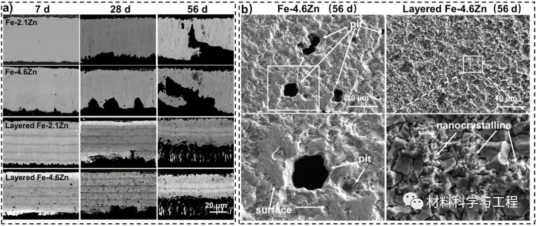Fig. 5. The corrosion morphologies of Fe-Zn alloys. (a) Cross-section morphologies of Fe-Zn alloys after immersion test for 7, 28, 56 d. (b) Surface morphologies of Fe-4.6Zn and layered Fe-4.6Zn after immersion test for 56 d.