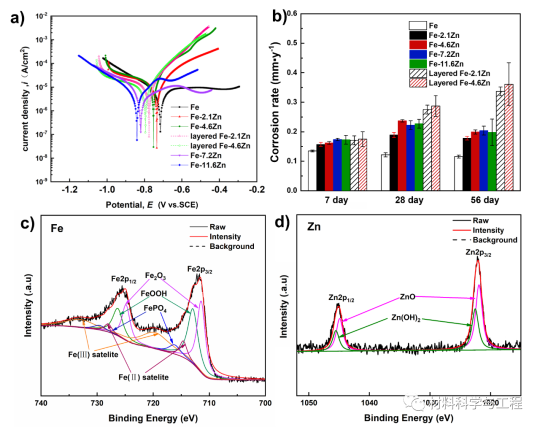 Fig. 4. Corrosion assessment of the Fe-Zn alloys. (a) Potentiodynamic polarization curves. (b) The corrosion rate measured by the weight-loss method after immersion test. (c and d) XPS spectra of Fe-11.6Zn alloy after immersion.
