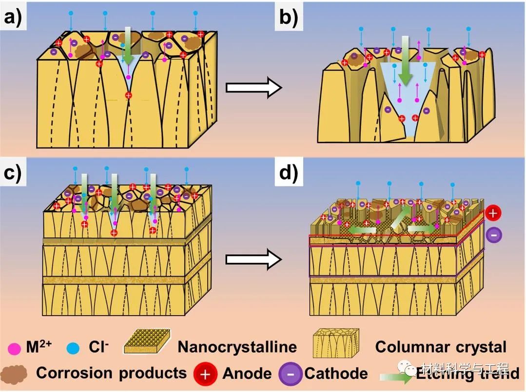 为解决这个问题,大连理工大学材料学院王伟强团队提出将活性更高的Zn与Fe合金化,制备以Fe为基体的Fe-Zn合金,有望满足降解速率要求,同时保留铁的固有机械性能。而Zn与Fe熔沸点差距大,给材料制备也增加了难度。为获得质量较好的Fe-Zn合金,用电沉积来替代传统的冶金手段不仅可以获得熔沸点差距较大的二元合金,同时这种原子级的互竞共沉积也可以得到亚稳态的Fe-Zn合金,进一步提高材料的腐蚀速率。在这份工作中还对合金进行了层状结构设计,通过调控电参数,制备了纳米晶和超细柱状晶组织交替生长的层状结构。评估了合金的成分、微观结构、机械性能、体外降解性能和生物相容性。