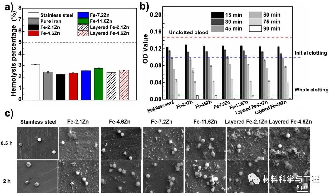 Fig. 8. Blood compatibility tests on the Fe-Zn alloys (316L stainless steel as control). (a) Hemolysis rates of stainless steel and Fe-Zn alloys. (b) The whole blood clotting on different surfaces for up to 90 min. (c) The adhesion morphology of platelets on Fe-Zn alloys.