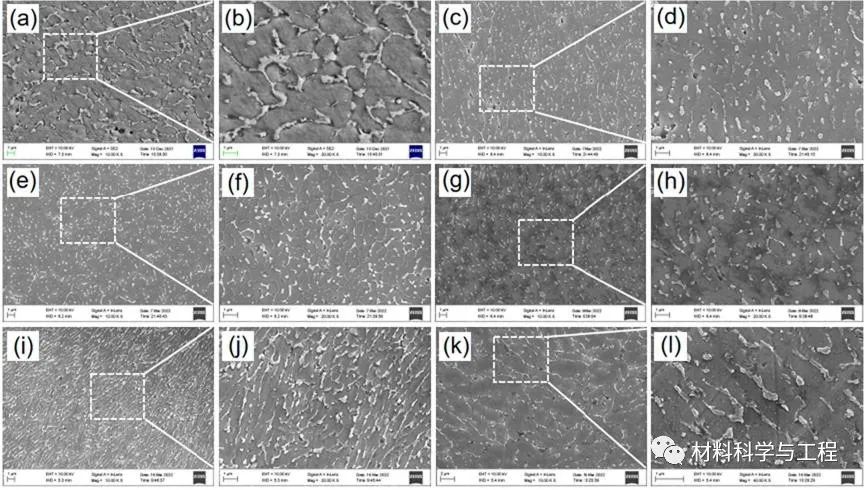 图1:不同工艺下的SEM形貌(a)打印态;(b)图a中白色方框局部放大图;(c)150℃×2h;(d)图c中白色方框局部放大图;(e)150℃×4h;(f)图e中白色方框局部放大图;(g)150℃×14h;(h)图g中白色方框局部放大图;(i)120℃×4h;(j)图i中白色方框局部放大图;(k)240℃×4h;(l)图k中白色方框局部放大图