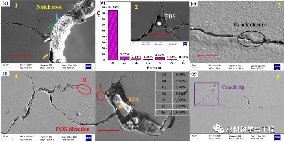 图5 (a) OM和(b) SEM拍摄的疲劳裂纹扩展路径;(c) (b)中区域1的放大;(d) (b)中区域2的放大和相应的EDS结果;(e) (b)中区域3的扩大;(f) (b)中区域4的放大和相应EDS结果(wt.%);(g) (b)中区域5的放大