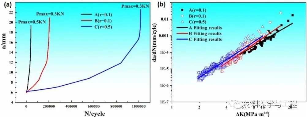 图7 (a)裂纹长度与疲劳循环(a-N)曲线;(b)不同试样的的FCG速率比较;(c)疲劳裂纹扩展试验后试样的形貌
