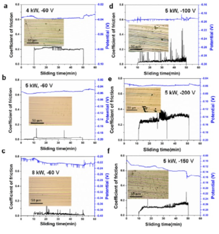 图20 使用HiPIMS沉积的Ti-C-N涂层在不同目标功率和负基底偏差下沉积在3.5wt%NaCl水溶液中的摩擦腐蚀行为。