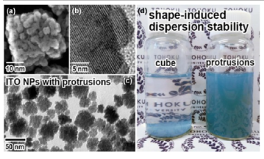 图9 (A-C)突起形铟锡氧化物颗粒的SEM和HRTEM图像和(d)形状诱导的分散稳定性。