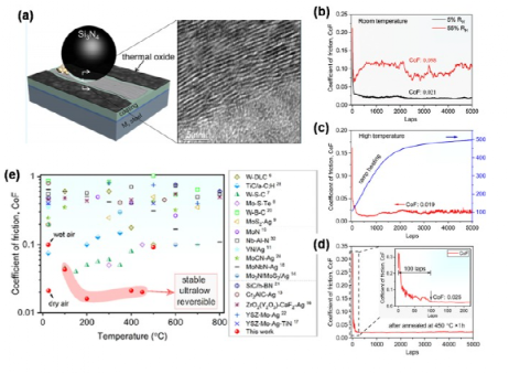 图46 (a) WS2/a-C涂层在高温下的自适应摩擦机理示意图以及薄膜的HRTEM图像;(b) 室温下在干燥空气(5%相对湿度)和环境空气(55%相对湿度)下进行测试,(c)在环境空气中(55%相对湿度)中连续将温度从100°C提高到500°C进行测试,以及(d)在室温下在干燥空气(5%RH)下测试WS2 / a-C涂层在450°C退火1小时。插入物显示,仅在 100 圈后达到 0.025 <超低 CoF,并保持 5000 圈; (e) 将这项工作的CoF与在25至800°C的温度范围内进行的摩擦测试的文献进行比较:WS2 / a-C涂层(见突出显示的值)在25°C(干燥空气)至500°C范围内表现出超低CoFs。请注意,100°C是消除湿度影响的临界温度,在500°滑动2000圈后,CoF跃升至>0.1C表示所研究的WS2/a-C涂层。