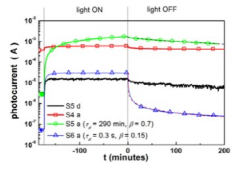 图38 具有不同氮含量的ZnOxNy薄膜在蓝光(405±10 nm)照射(如沉积薄膜S5d和退火薄膜S4a,S5a和S6a)的开关循环期间的瞬态光电流强度。光照射时间期间光电流的时间变化拟合了方程(2)描述的拉伸指数衰减(仅显示了退火薄膜S5a和S6a的拟合图)。(有关此图例中对颜色的引用的解释,读者请参阅本文的网络版本。