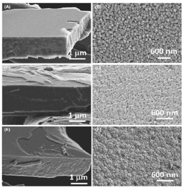 图12 沉积在AISI 304L不锈钢上的TiAlSiN涂层的横截面和俯视图FESEM显微照片,通过DOMS:(a,b)-30 V的各种基材偏置;(C,D) ?60 V 和 (E,F) ?120 V 。