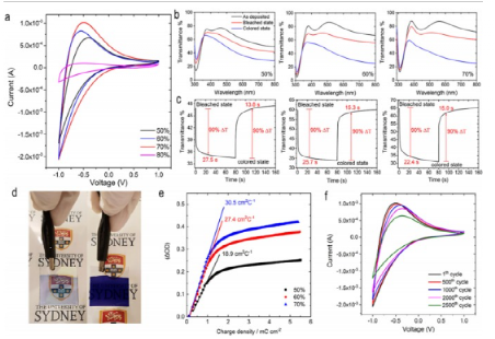 图37 HiPIMS 溅射 WO3/Ag/WO3 涂层的 EC 行为表征。(a) 以各种 O2/(O2 Ar) 流速比沉积的 DMD 结构的 1 M LiClO4 - PC 电解质中的 CV,在 1.0 和 - 1.0 V 之间的电压下以 100 mV/s 的扫描速率测量(有效面积 = 1 平方厘米)。(b) 在 λ = 300–800 范围内的彩色(蓝色曲线)、漂白(红色曲线)和沉积(黑色曲线)状态下,WO3/Ag/WO3 涂层在不同 O2/(O2 Ar) 比率下的光学透射光谱纳米。(c) 在 633 nm 处测量的 WO3/Ag/WO3 涂层的光学响应,以 50%、60% 和 70% 的各种 O2/(O2 Ar) 流量比沉积,在着色和漂白状态下在 1.0 和 - 的电压之间切换1.0 V。(d) WO3/Ag/WO3 (30 nm/10 nm/50 nm) 涂层的漂白和着色状态的光学图像。用于沉积内部和外部 WO3 层的 O2/(O2 Ar) 流速比分别为 80% 和 70%。(e) 光密度曲线作为交换电荷的函数。所示曲线的斜率代表 CE。(f) WO3/Ag/WO3 涂层在 1 M LiClO4 - PC 电解质中的 CV 稳定性在 1.0 和 - 1.0 V 之间,扫描速率为 100 mV/s [107]。(为了解释这个图例中对颜色的引用,读者可以参考本文的网络版本。)