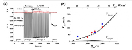 图41 (a) DOMS 电源脉冲周期的电流和电压图,(b) Cu 薄膜的沉积速率取决于一段时间内的平均功率 Qper 和功率密度 Pper。这里,线条是计算(实线是ArS模式,虚线是SSS模式);圆点是磁控管运行时使用不同电源(正方形-MF 电源,圆圈-DOMS 电源)的实验结果。