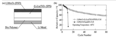 图43 复合材料型全固态锂二次电池;(b)复合型全固态电池和液体电池的充放电循环特性。工作条件:4.3 V/3.0 V截止,60°C 。