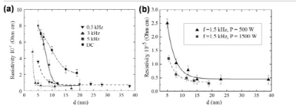 图40 HiPIMS沉积的超薄铜膜电阻率的厚度依赖性:(a)与直流磁控溅射相比,(a)不同的平均放电功率,(b)脉冲频率。