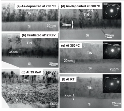 图24 TiN涂层的横截面透射电镜显微照片:(a)沉积在700°C,(b)以4×1016cm2的剂量在12keV下照射,(c)在35keV下以1×1017/cm2的剂量照射,(d)在500°C下沉积,(e)在350°C下沉积,(f)在室温下以2keV照射,剂量为4×1016cm2。