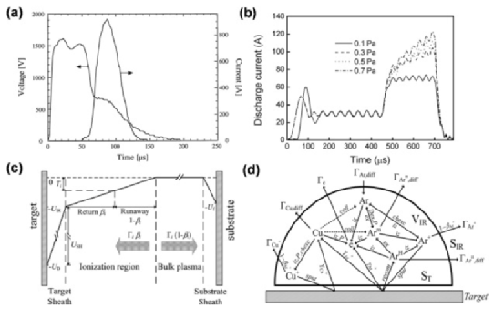 图3 (a)用于铜涂层沉积的HiPIMS和(b)MPPMS脉冲形状,(c)靶材和基板之间的MPPMS等离子体放电,包括靶鞘,电离区,体等离子体和基板鞘,以及电势分布和离子返回和失控的可能性(d)。