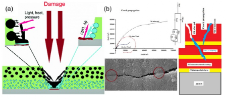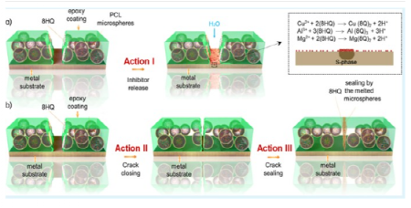 图45 通过(a)从PCL微球释放的8HQ实现的三重作用自愈机制,主要通过由Al2CuMg组成的S相金属间化合物抑制局部腐蚀(动作I),(b)形状记忆环氧聚合物闭合裂纹的协同效应(动作II)和熔化微球的裂纹密封(动作III)。