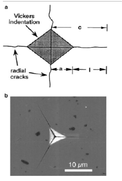 图15 (a)维氏压痕径向裂纹示意图,以及(b)超低负载纳米压痕径向裂纹。