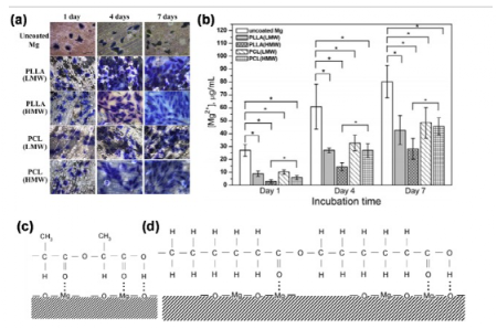 图44 (a) 在不同镁样品上孵育1、4和7天后的细胞形态;(b) 在细胞培养过程中从未包被和聚合物包被的镁中释放Mg2+;(c) 聚合物涂层与聚合物链端的镁基底之间相当静电的分子间相互作用示意图。(a) PLLA,(b) PCL。虚线表示静电相互作用。