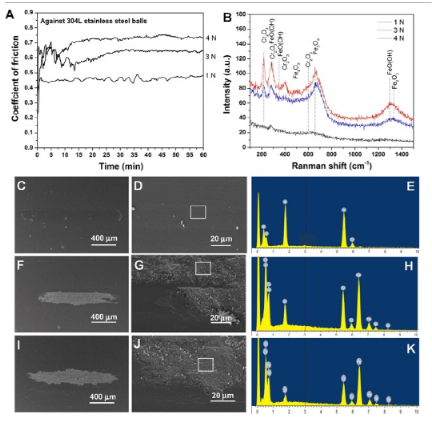 图28 CrN/Si3N4多层涂层的摩擦和磨损性能,15.2 at.% Si:A,摩擦系数。B,磨损表面的拉曼光谱。C-E,在1 Hz下,1 N、3 N(F-H)和4 N (I-K)法向载荷下磨损表面的表面形态和EDS。