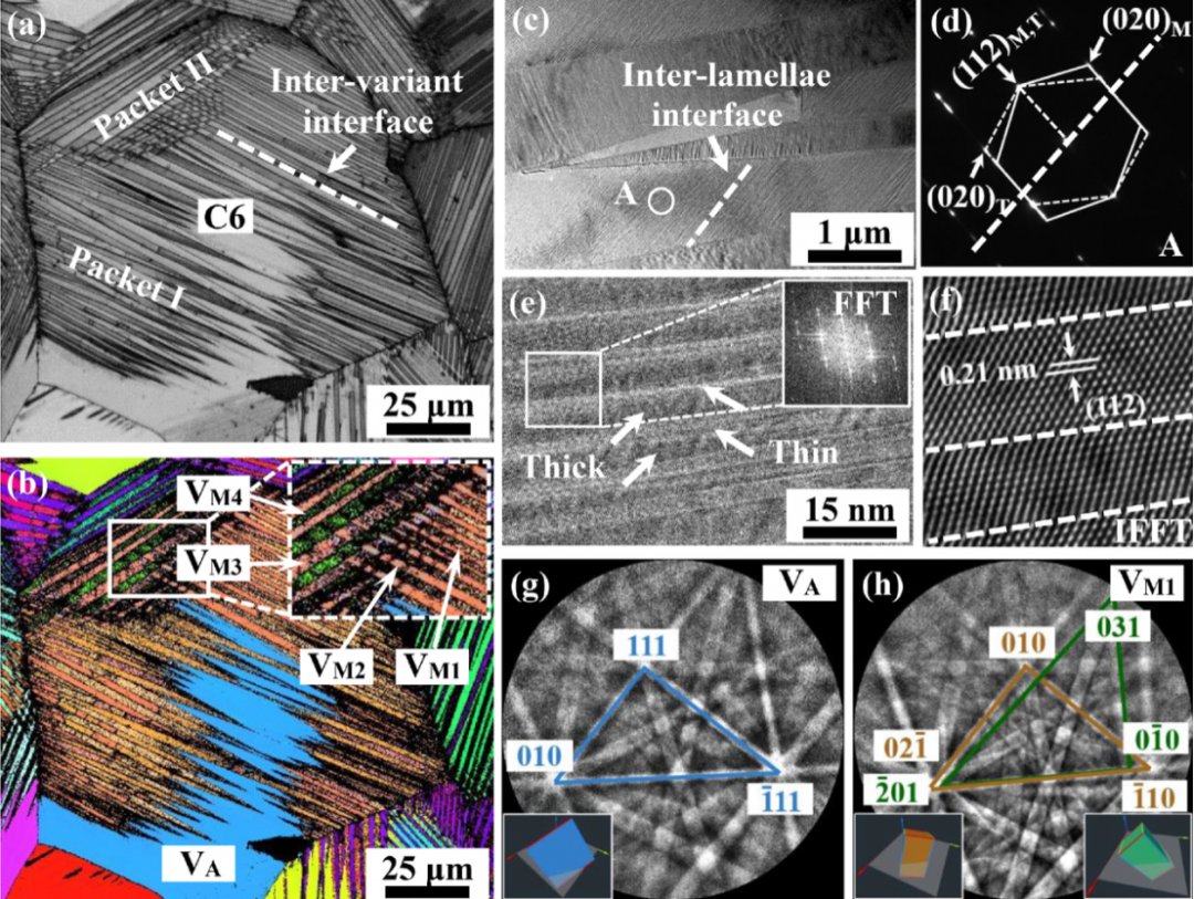 图3 .对双相Ni48合金进行EBSD和TEM联合分析。( a )图2a中菌落C6的EBSD条带对比图。( b )对应的晶体学取向显微照片显示在一个菌落中从一个取向的奥氏体转变为多个不同取向的微变异体s。( c )明场TEM图像和( d )对应的选区衍射花样取自区域A。( e )微变异体内部的高分辨TEM图像显示厚薄交替排列的纳米片层和( f )对应的白色框状区域的快速傅里叶逆变换( IFFT )图像。( g )和( h ) Kikuchi花样分别来自奥氏体VA和一个NM马氏体变体VM1。