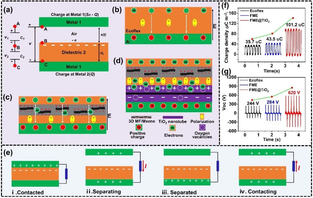 近日,国际学术期刊《纳米能源》在线报道了中科院海洋研究所在绿色能源电化学腐蚀防护研究的最新成果。该所海洋环境腐蚀与生物污损重点实验室从推动实现电化学腐蚀防护过程绿色化出发,面向海洋波浪能利用,开发了可独立供能的摩擦纳米发电机阴极保护系统。金属腐蚀严重影响海洋钢结构服役寿命,电化学防护是延长金属服役年限的重要手段。然而传统的阴极保护存在着能源和资源浪费、环境污染等问题,为了解决这一难题,开发新型清洁能源实现电化学腐蚀防护过程绿色化势在必行。近年来,摩擦纳米发电机(TENG)可以收集和捕获周围环境中的机械能,并能将其转化成电能已引起广泛关注,摩擦纳米发电机技术基于不同材料之间的接触起电和静电感应耦合效应,具有材料可用性广、重量轻、成本低、低频能量转化效率高等优点。海洋环境中存在丰富的可利用的机械能,如风能、波浪能、潮汐能等,这为利用摩擦纳米发电机实现电化学腐蚀防护绿色化提供了便利的能量来源。 记者从该所海洋环境腐蚀与生物污损重点实验室了解到,研究从推动实现电化学腐蚀防护过程绿色化出发,面向海洋波浪能利用,开发了具有可独立供能的摩擦纳米发电机阴极保护系统。聚焦复合电介质的电荷转移机制,综合考虑电荷产生、传输、俘获和耗散等因素,研究团队设计了三聚氰胺泡沫(MF)/MXene/Ecoflex@TiO2MXene/PDMS复合电介质材料。该复合电介质中MXene的均匀分布使得复合材料具有较强的电负性和导电性,并能形成大量的微电容,有利于复合电介质中表面电荷的生成、转移和保持。另外,TiO2纳米管阵列薄膜的高介电性能和电子俘获能力的双重功能有利于提升电学性能的输出。复合电介质电荷传输和捕获的协同效应机制及TENG输出性能