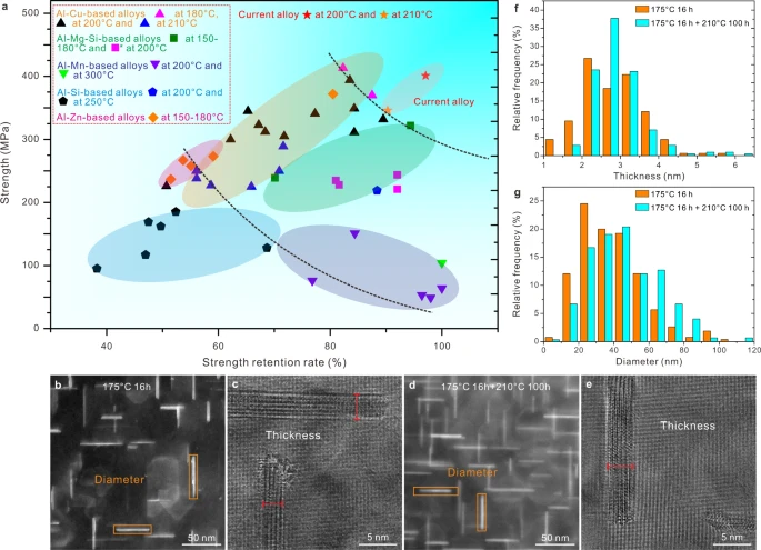 图1为当前Al-4Cu-0.315Mg-0.5Ag-0.21Si-0.09Sc合金的力学性能和析出相尺寸稳定性。不同铝合金在不同温度下热暴露100 h的屈服强度(抗拉强度上标*)和相应的强度保持率,更多细节可以在附表1中找到。b,c用于测量当前合金峰值时效状态下θ′- Al2Cu析出相直径和厚度的典型图像。d,e为热暴露后状态的典型图像。f,g分别为峰值时效和热暴露状态下当前合金的厚度和直径分布。