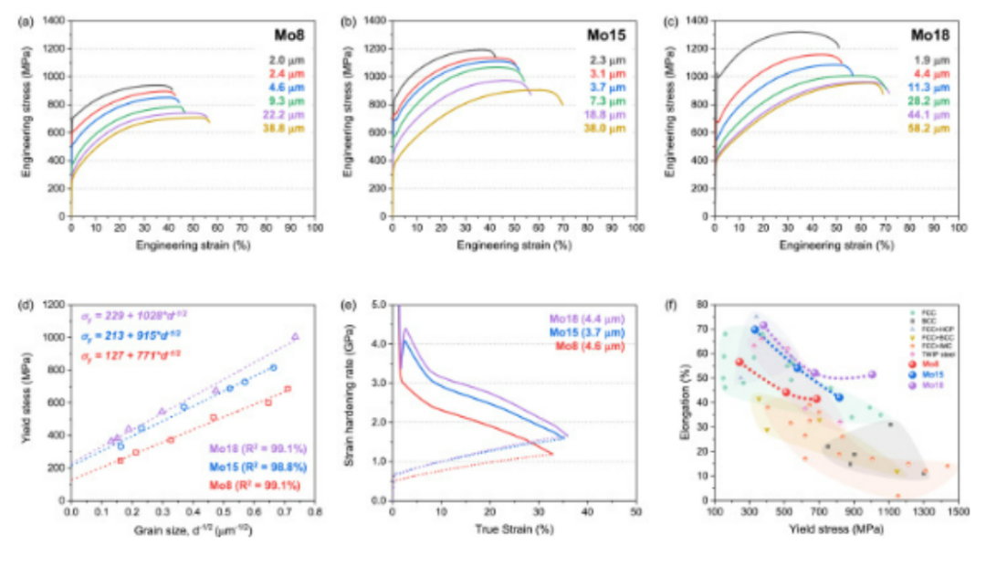 对于晶粒尺寸在~ 2 ~ 60 μm范围内的单一FCC固溶体Mo8、Mo15和Mo18合金,从Mo8到Mo18合金的强度和延展性同时提高。特别是,Mo18合金表现出优异的屈服强度为~ 1 GPa,抗拉强度为~ 1.3 GPa,塑性为~ 50%,尽管处于再结晶的单一FCC固溶体状态。