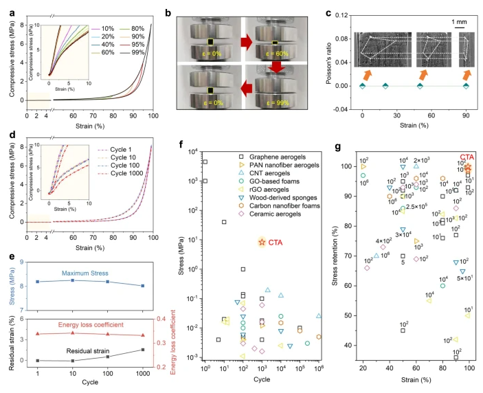 碳气凝胶是目前极少数可在极高温度(2000℃以上)无氧环境下保持力学稳定性的气凝胶材料,在国防、能源及智能传感等方面具有广阔的应用前景,但其脆性限制了其广泛应用。近年来,科研人员以石墨烯、碳纳米纤维、碳纳米管等柔性纳米结构为基本组成单元,相继开发出了具有一定压缩回弹特性的气凝胶。但其压缩强度普遍偏低(几到几百千帕),承载能力不足。但提高气凝胶的承载能力,往往又伴随着其变形能力的下降。因此,如何破解高承载和大变形之间的矛盾,进一步提升碳气凝胶的综合力学性能,仍是一个巨大的挑战。
