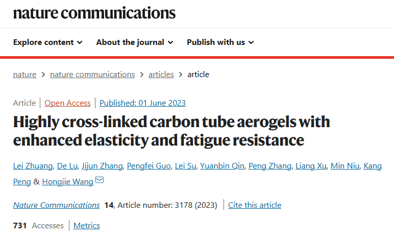 该研究成果以“Highly cross-linked carbon tube aerogels with enhanced elasticity and fatigue resistance”为题近日在线发表于《自然通讯》(Nature communications)上。西安交通大学材料学院青年教师庄磊为论文第一作者,王红洁教授为论文通讯作者。西安交通大学金属材料强度国家重点实验室是该工作的唯一通讯单位。该工作得到了国家自然科学基金(92263204、52102077、 52072294)的支持。