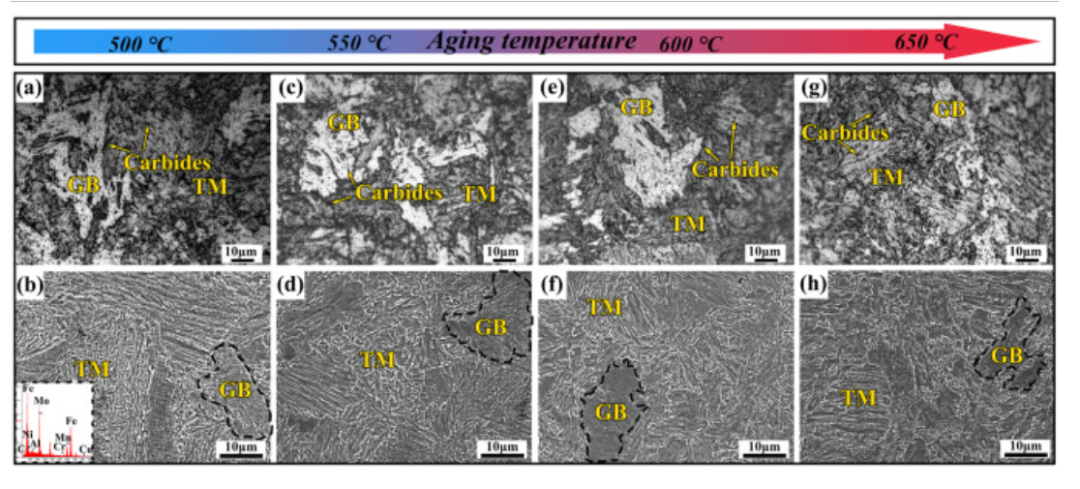 导读:本文采用热轧调质工艺制备了低碳超高强度马氏体无缝钢管。根据Cu和NiAl的显微组织和共析出演化机制评价了复合材料的多种强化机制,并系统地讨论了与多尺度显微组织相关的增韧机制。结果表明:实验钢在淬火状态下的组织由87.8%的板条马氏体(LM)和12.2%的粒状贝氏体(GB)组成,而在QT状态下的组织包括回火马氏体(TM)、GB和少量的反向奥氏体。QT钢的TEM形貌显示富cu、NiAl和Cu-NiAl共析出三种类型的纳米颗粒,随着时效温度从500℃升高到650℃,纳米颗粒明显变粗,数量密度急剧下降。纳米粒子共析出演化机制表明,高密度的小尺寸BCC-Cu和B2-NiAl粒子对强化增量最有利。实验钢在500℃时效时的极限屈服强度为1332.5 MPa,这是由于高析出强化651.2 MPa(剪切强化和Orowan强化的综合叠加)和位错强化454.8 MPa所致。实验钢具有明显的低温增韧,随着时效温度从500℃升高到650℃,-40℃时的冲击能从5J增加到237 J。优异的低温韧性是由于位错密度的降低、剪切机制的弱化和少量反向奥氏体的转变提高了裂纹成核能,HAGB数量分数的增加和显著的塑性变形提高了裂纹扩展能。