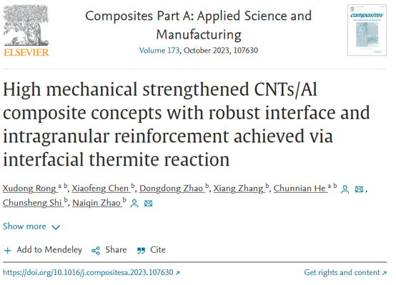 考虑到这一点,天津大学赵乃勤教授团队开发了一种经典的无电镀铜结合氧化法制备可控大小的Cu2O纳米颗粒覆盖在CNTs的外壁上(Cu2O@CNTs)。随后,Cu2O@CNTs-Al复合粉末的固态烧结使涂层的Cu2O与Al基体发生原位界面热合成反应,促进了Al2O3中间层以及纳米级Al2O3晶须和CuAl2颗粒的生成。基于全面的表征,研究了这种界面微观结构和晶内增强物的形成机制。此外,还详细探讨了有助于材料杰出机械性能的强化和韧化机制。相关研究成果以题“High mechanical strengthened CNTs/Al composite concepts with robust interface and intragranular reinforcement achieved via interfacial thermite reaction”发表在Composites Part A:Applied Science and Manufacturing上。