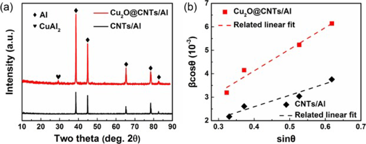 图12. (a) Cu@CNTs/Al和Cu2O@CNTs/Al复合材料在拉伸测试后的XRD图谱。(b) 基于Williamson-Hall方程的线性拟合,用于估计位错密度,其中参数从(a)中收集。