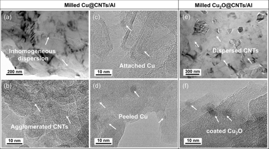 图4. 典型的显微结构,显示球磨后的(a)~(d)Cu@CNTs-Al和(e)~(f)Cu2O@CNTs-Al复合粉末。