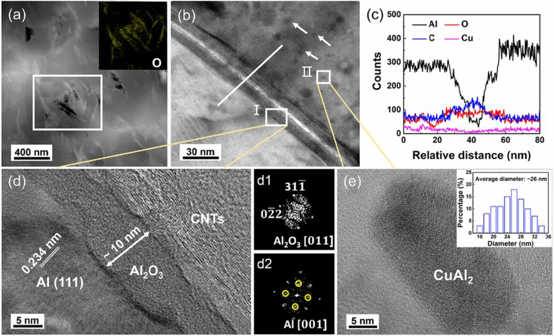 图6. Al2O3中间层和Cu2O@CNTs/Al复合材料中形成的CuAl2的TEM表征。(a) Cu2O@CNTs/Al复合材料的典型HAADF-STEM图像,插图显示O元素分布。(b) CNTs-Al界面的TEM图像。(c) 在(b)中CNTs-Al界面的EDS线扫描分析。(d) 在(b)中记录的I框架的放大图像,其中d1和d2是Al2O3和Al的FFT图像。(e) 在(b)中记录的II框架的放大图像,插图显示CuAl2沉淀的直径的统计结果。
